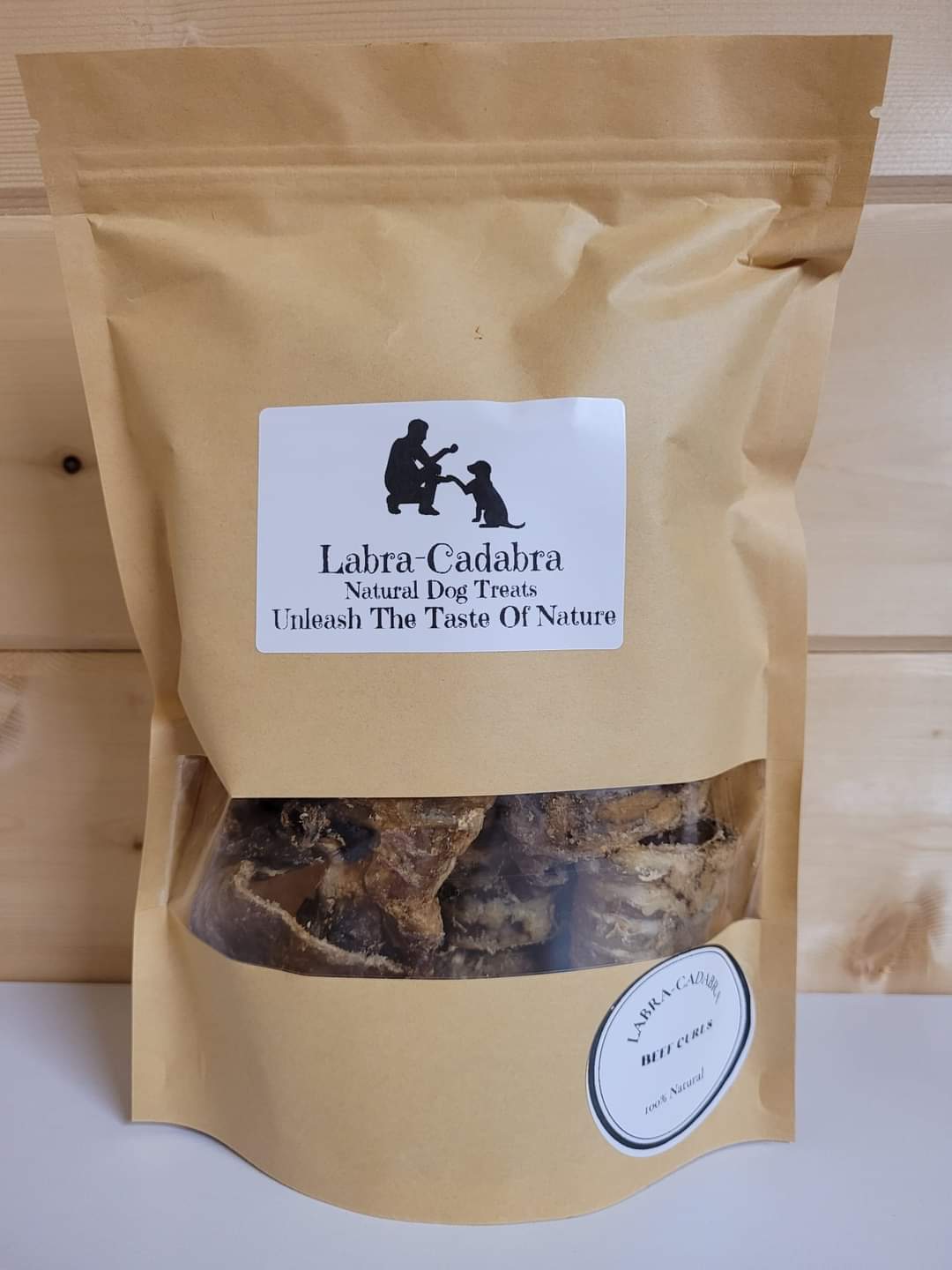 Our dehydrated Beef Curls are hollow chews crafted from cow windpipes. Their unique shape allows for filling with various products, including your dog's regular food, or our luxury range of patès extending their longevity.