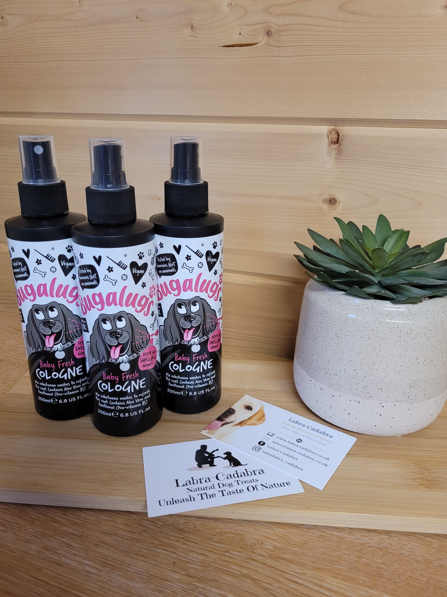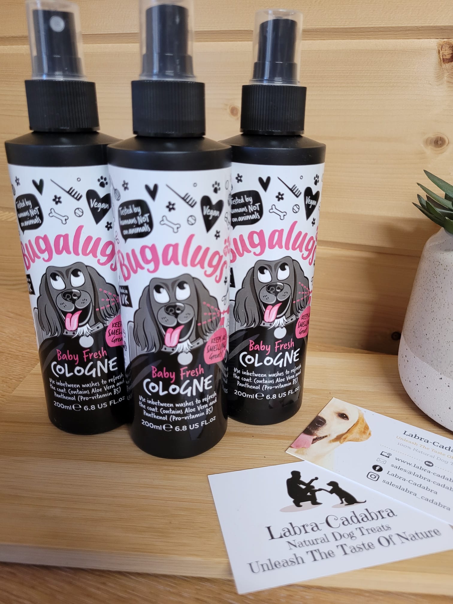 Enriched with the natural goodness of Aloe Vera and Pro-Vitamin B5, Bugalugs Baby Fresh Cologne goes beyond just scent. Aloe Vera’s soothing properties calm and comfort your pet’s skin, while Pro-Vitamin B5 promotes a lustrous and healthy coat. Plus, our vegan-friendly, pH-balanced formula is safe and effective for dogs of all breeds, including puppies over 8 weeks old.