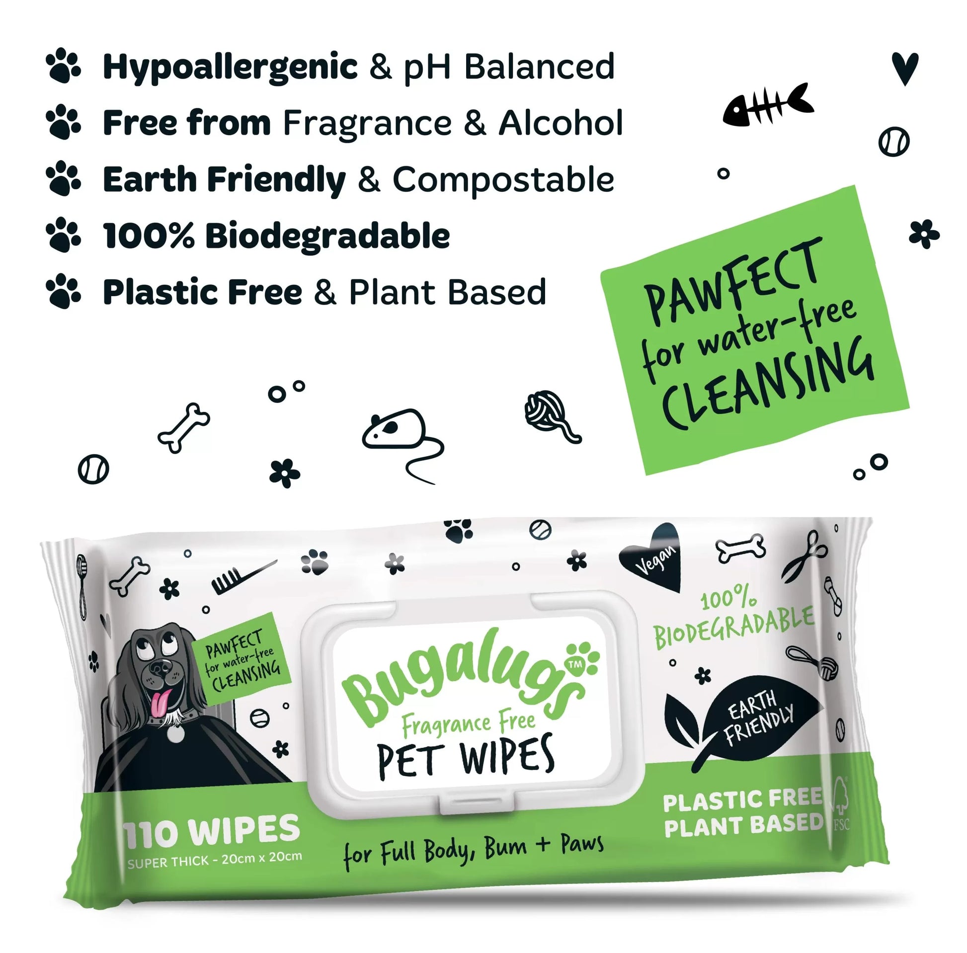 - Earth friendly – The Bugalugs dog wipes are 100% plastic free biodegradable wipes, made from plant based cellulose fibres sourced from renewable resources which are compostable