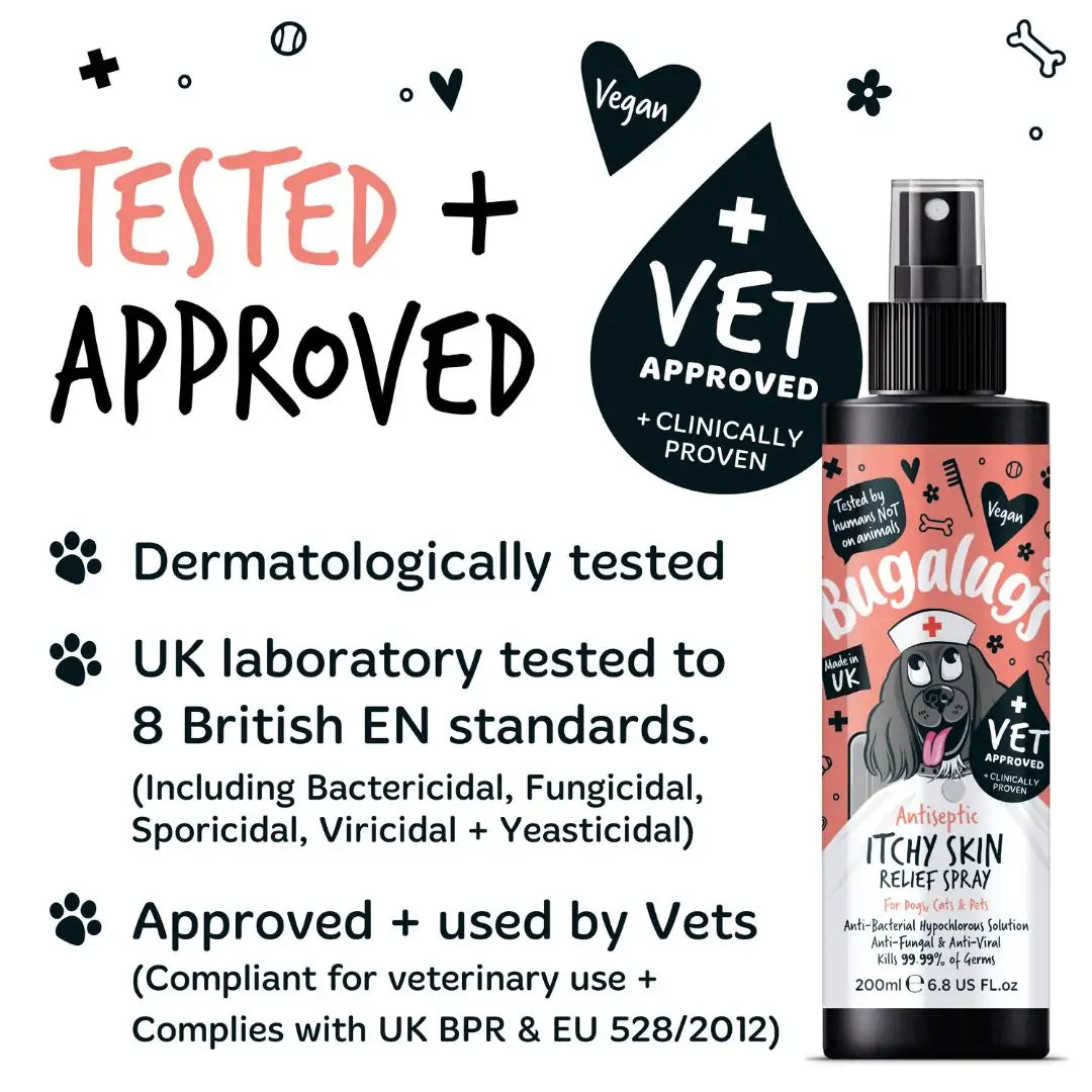 Bugalugs Antiseptic Itchy Skin Relief Spray Complies with UK BPR & EU 528/2012. Independently tested to the following standards EN 13697, EN 1656, EN 1276, EN 13704, EN 14476, EN14204, EN13727 & EN1650. Compliant for veterinary Biocidal use.