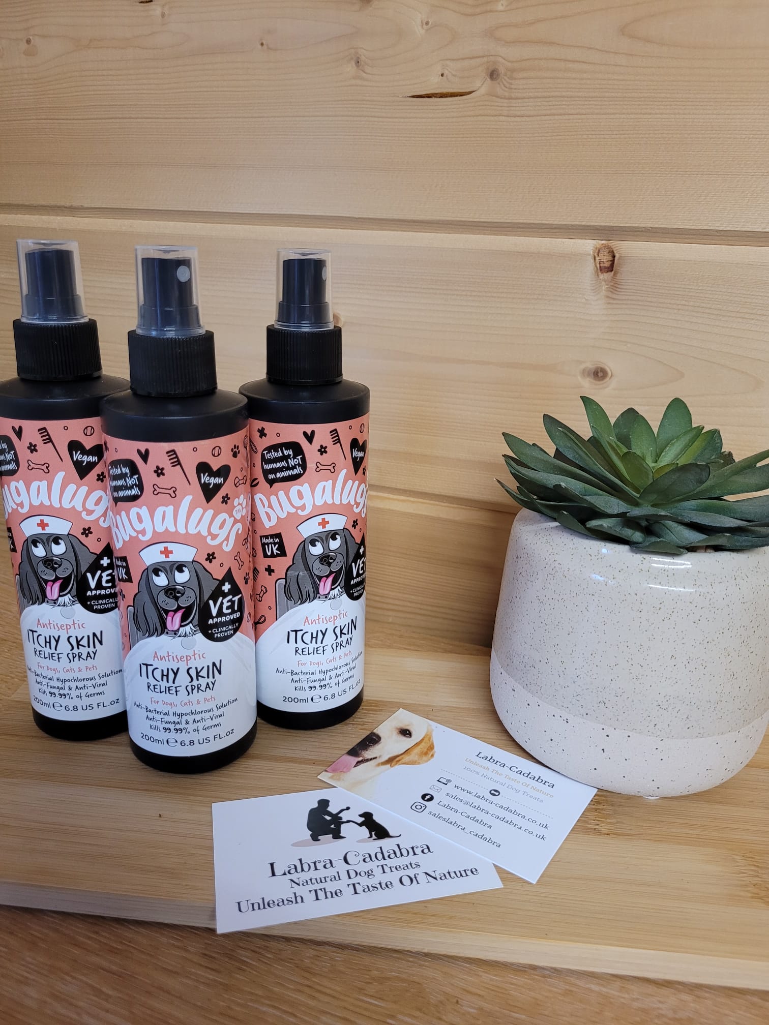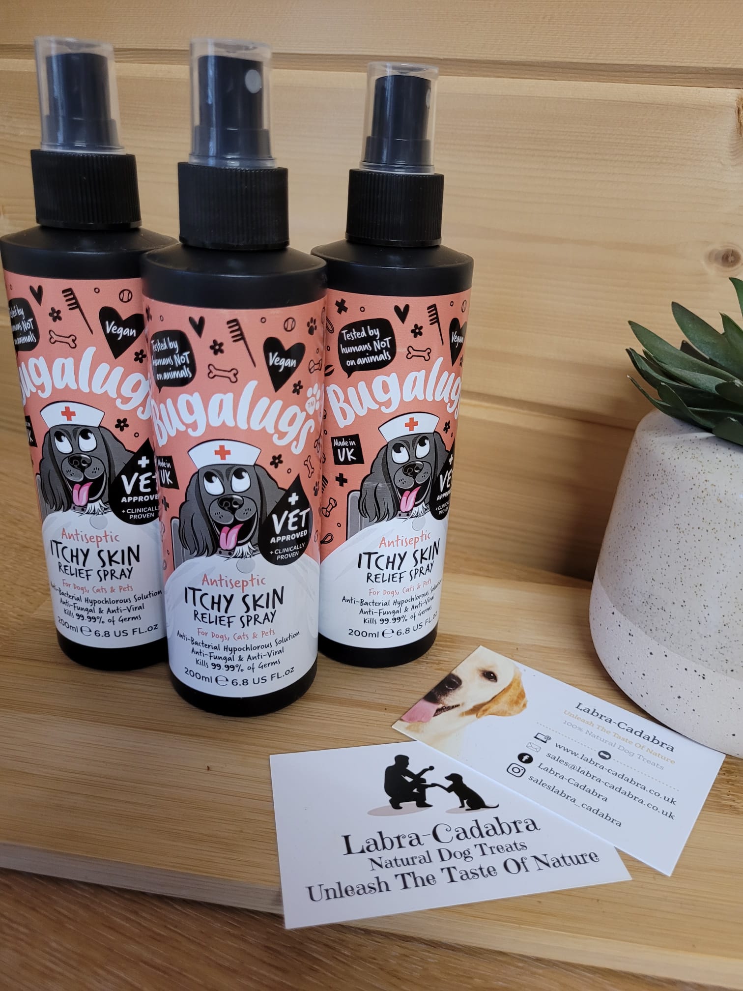 Bugalugs Antiseptic Itchy Skin Relief spray is a clinically proven advanced formula utilising hypochlorous acid, produced by your pet’s immune system as a response to combat infections.
