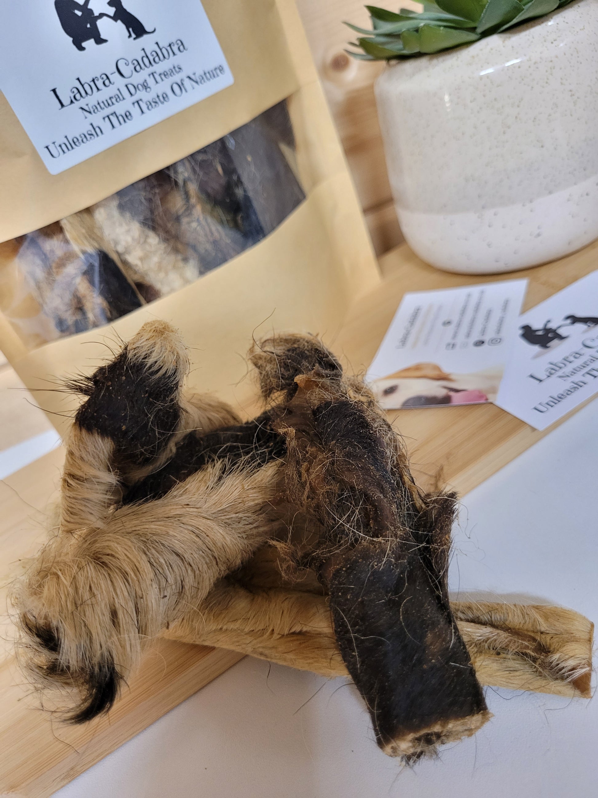 As well as, the hair is another added benefit. It may look a little strange, but don't be put off! The hair on treats can actually help the removal of any parasites from the intestinal tract.