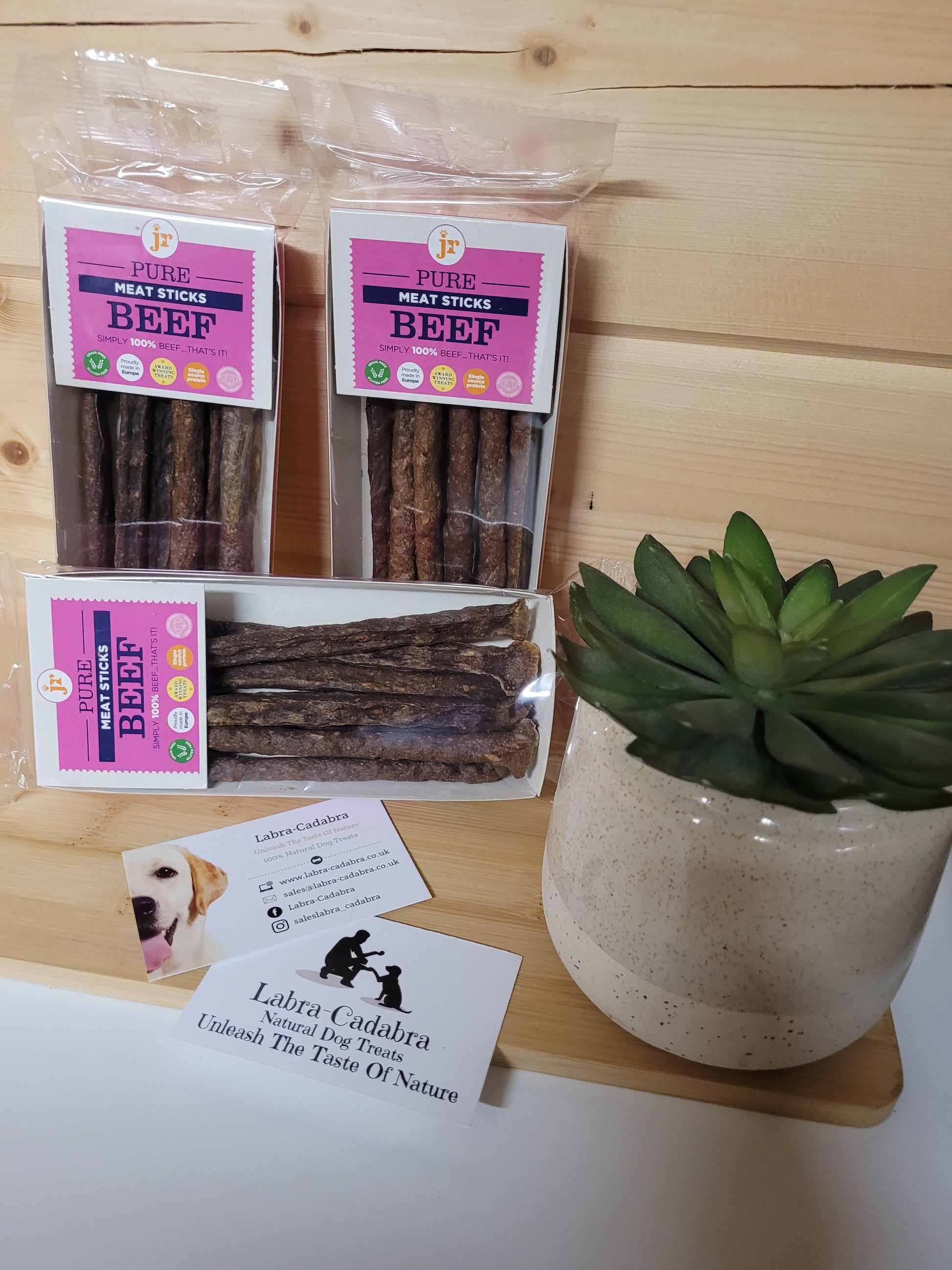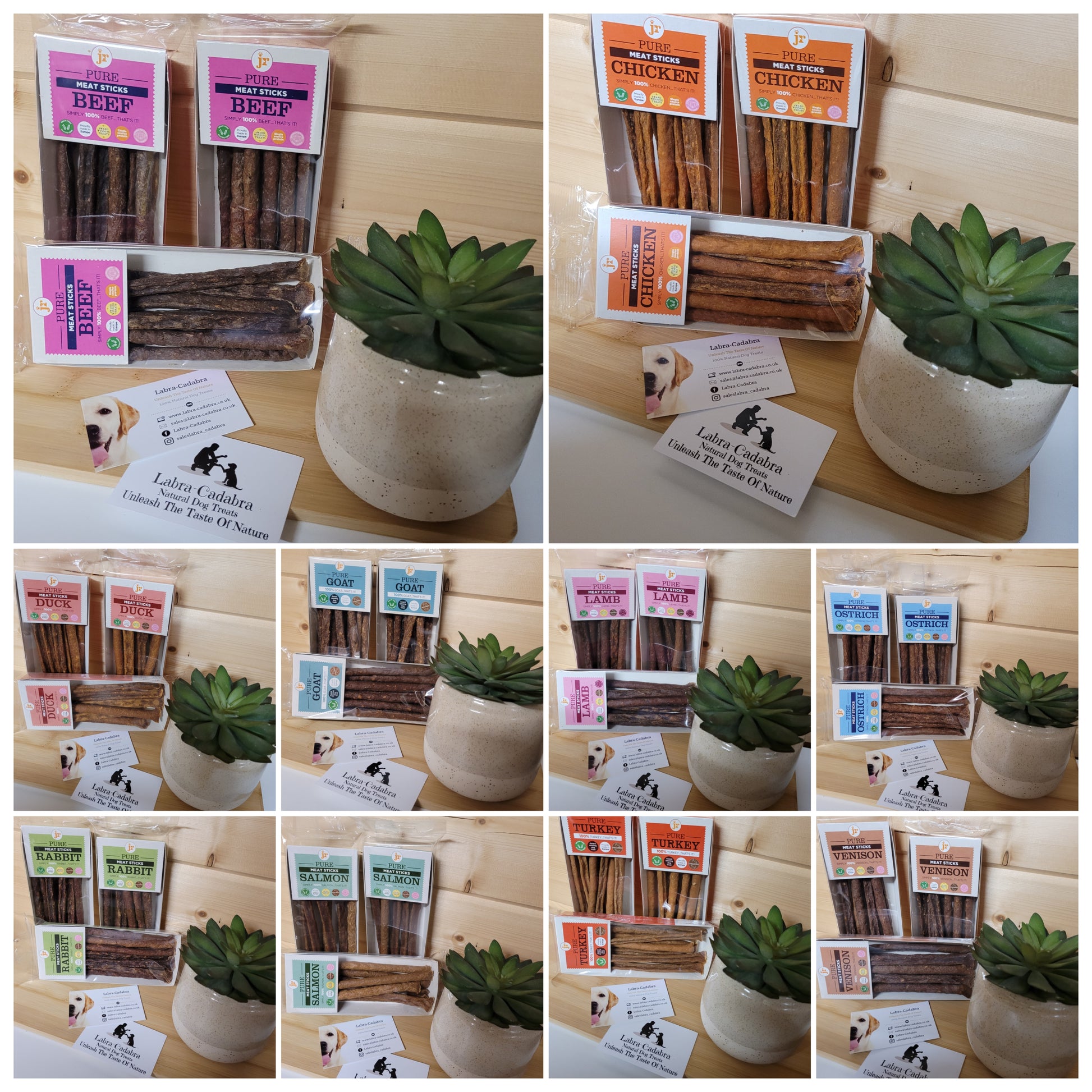 Our delicious Pure Meat Sticks are all made from 100% Prime cuts of Meat, No Additives, No Preservatives, Nothing! They come in 10 flavours for your dog to savour and enjoy. They're Grain and Gluten Free and suitable for all dogs, no matter their breed or size. Many of these treats are Hypoallergenic too, so great for those with allergies or sensitivities. Highly palatable and easily digestible these Treats can be used for reward, training treats or for use with enrichment toys.