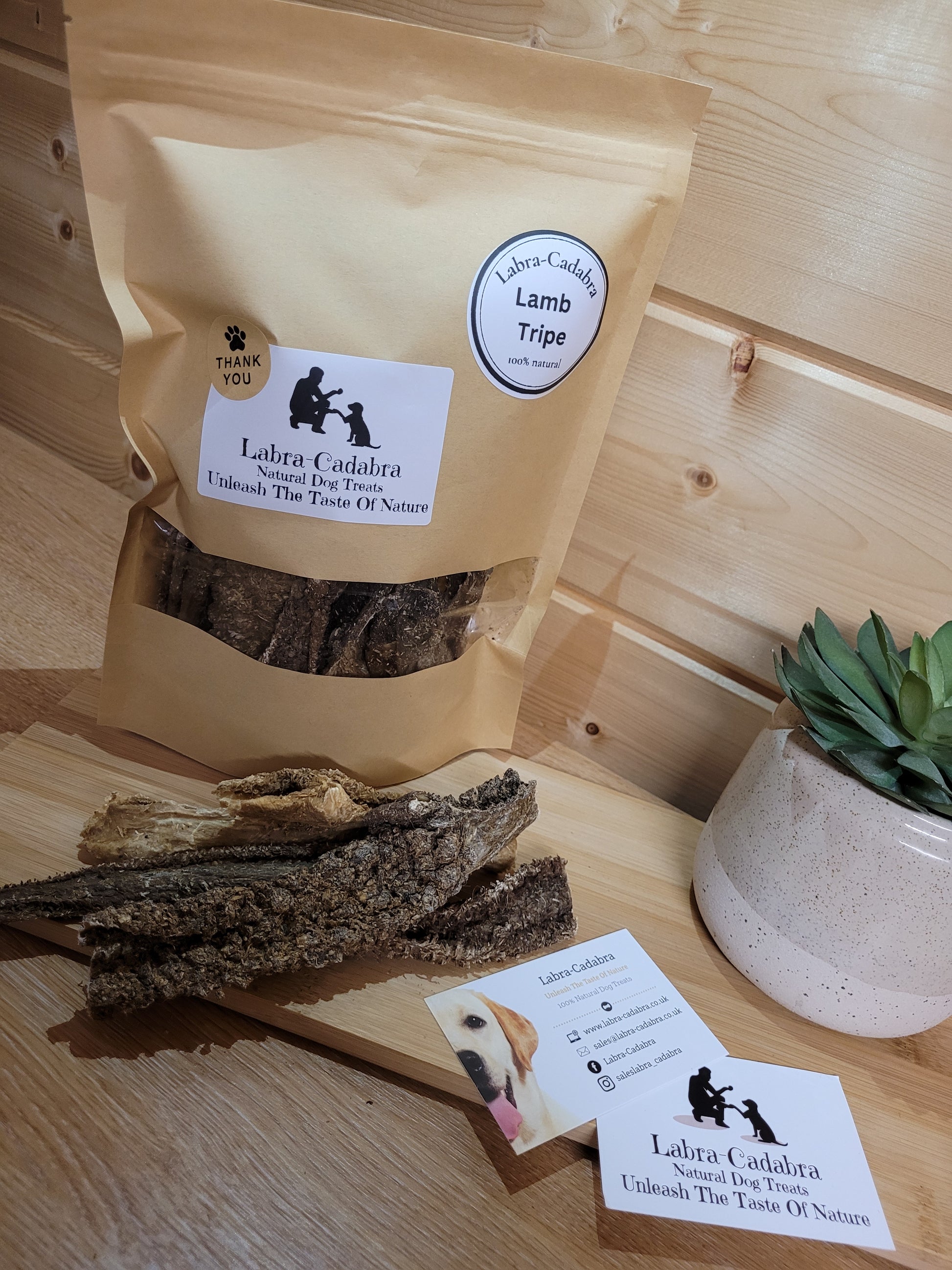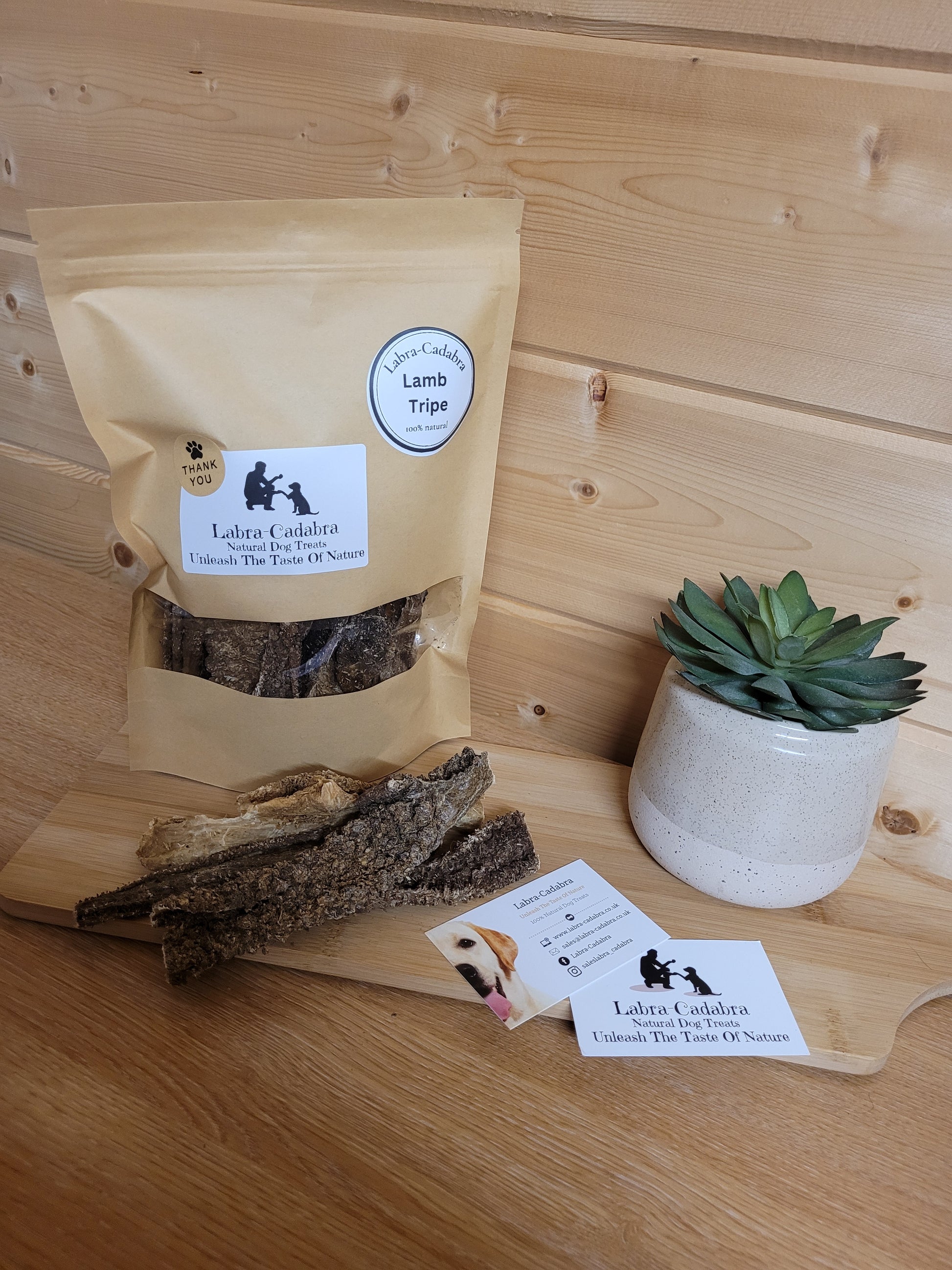 Our 100% natural Lamb tripe sticks are a rich and nutritious snack for your dog which are 100% digestible and hypoallergenic. Gently air dried to keep in the flavour these treats are both Grain & Gluten free, High in protein, Rich in iron and minerals.